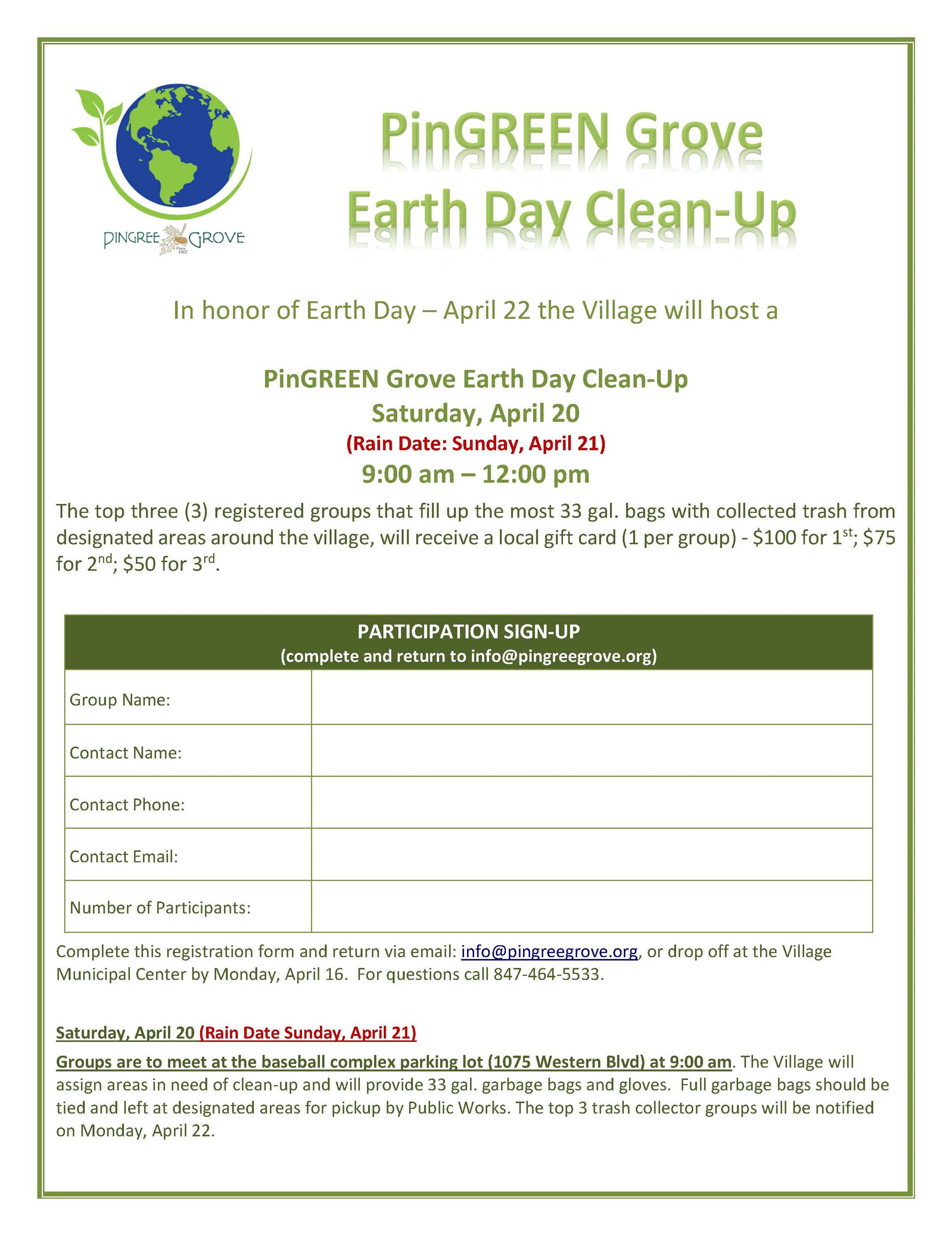 In honor of Earth Day – April 22 the Village will host a  PinGREEN Grove Earth Day Clean-Up  Saturday, April 20 (Rain Date: Sunday, April 21) 9:00 am – 12:00 pm