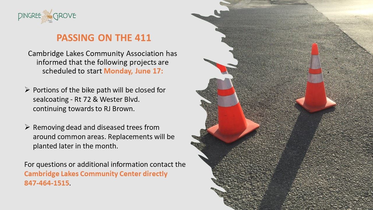 Cambridge Lakes Community Association has informed that the following projects are scheduled to start Monday, June 17: