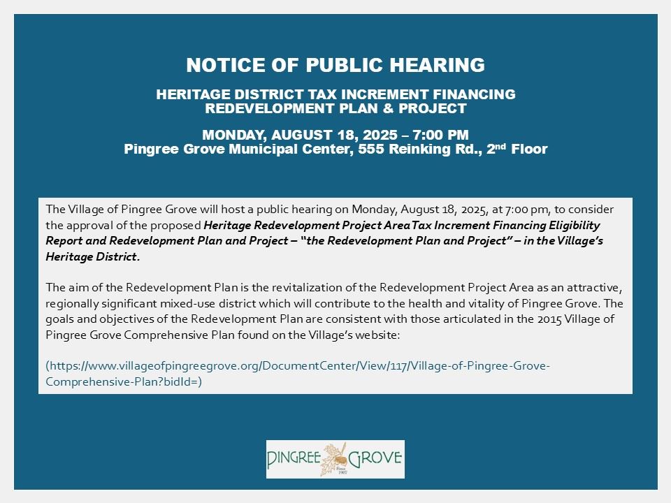 The Village of Pingree Grove will host a public hearing on Monday, August 18, 2025, at 7:00 pm, to consider the approval of the proposed Heritage Redevelopment Project Area Tax Increment Financing Eligibility Report and Redevelopment Plan and Project – “the Redevelopment Plan and Project” – in the Village’s Heritage District.