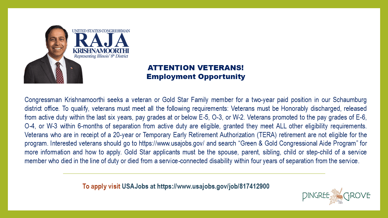 Congressman Krishnamoorthi seeks a veteran or Gold Star Family member for a two-year paid position in our Schaumburg district office. To qualify, veterans must meet all the following requirements: Veterans must be Honorably discharged, released from active duty within the last six years, pay grades at or below E-5, O-3, or W-2. Veterans promoted to the pay grades of E-6, O-4, or W-3 within 6-months of separation from active duty are eligible, granted they meet ALL other eligibility requirements. Veterans who are in receipt of a 20-year or Temporary Early Retirement Authorization (TERA) retirement are not eligible for the program. Interested veterans should go to https://www.usajobs.gov/ and search “Green & Gold Congressional Aide Program” for more information and how to apply. Gold Star applicants must be the spouse, parent, sibling, child or step-child of a service member who died in the line of duty, or died from a service connected disability within four years of separation from the service. The link to the USAJobs Posting is  USAJOBS - Job Announcement